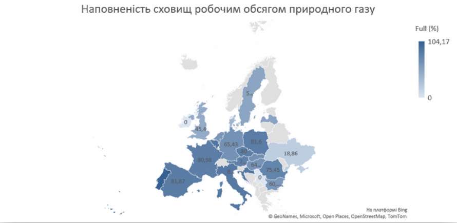 Рівень заповнення сховищ найкрупнішого експортера LNG, США, за останніми даними EIA на 8 серпня 2025 р. складав 3,186 млрд куб. футів., що на 6,6% вище середнього показника за останні п’ять років.