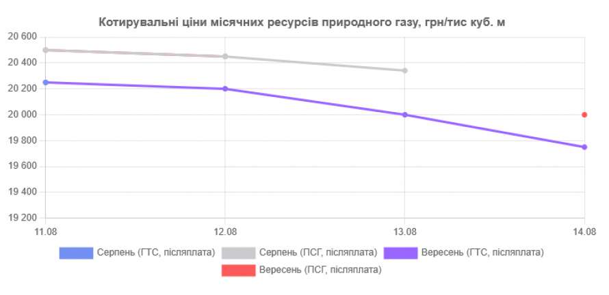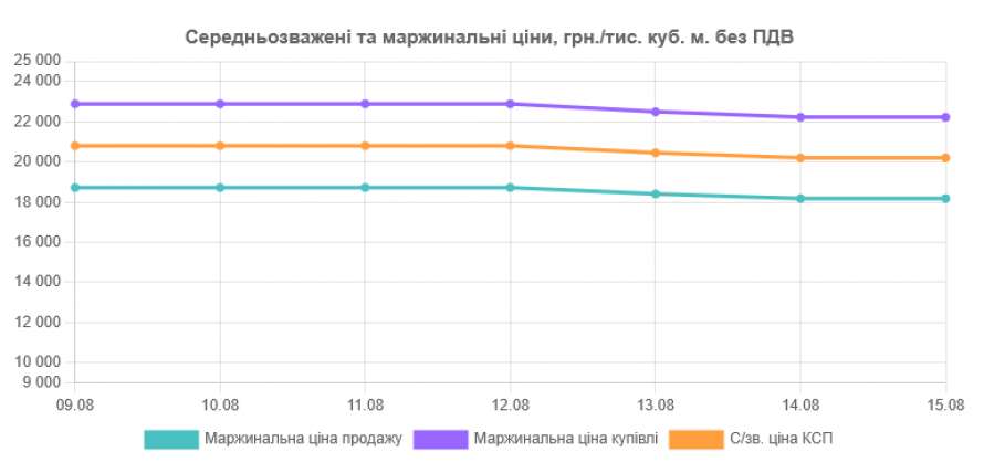 На короткостроковому ринку природного газу УЕБ учасники формували заявки на внутрішньодобовому ринку. Угоди було укладено з постачанням у ГТС України. Середньозважена ціна КСП у п’ятницю, 15 серпня, склала 20200 грн без ПДВ.