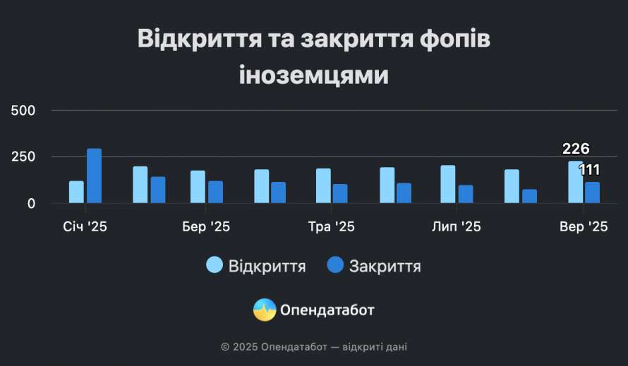 Водночас 1158 фопів-іноземців за цей самий час припинили свою діяльність. Чистий приріст склав 490 підприємців-нерезидентів. Загалом понад 213 тисяч підприємців закрилися в Україні за цей період, тож частка іноземців складає лише 0,5%.