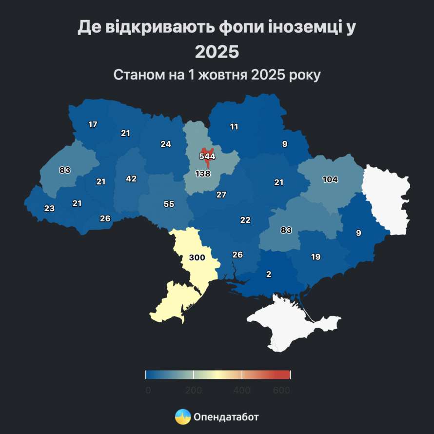 Кожен третій іноземець розпочинає свою справу у Києві: 544 фопи цьогоріч. Далі йдуть Одещина із 300 фопами (18%), Київщина — 138 (8%), Харківщина — 104 (6%) та Львівщина — 83 (5%). Найменше іноземних підприємців зареєстровано у Волинській, Чернігівській, Сумській, Донецькій і Херсонській областях — від 2 до 17 фопів.