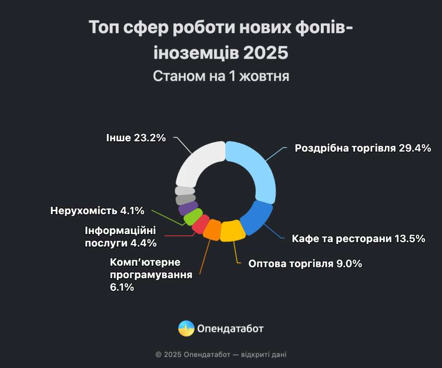 Переважна більшість іноземців обирає бізнес у сфері торгівлі — майже кожен третій бізнес. До слова, ця сфера має попит й серед фопів українців. Наслідують громадське харчування (14%), оптова торгівля (9%), комп'ютерне програмування (6%) та надання інформаційних послуг (4%).