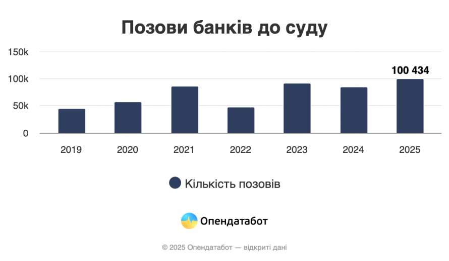 100 434 позови до боржників подали українські банки. Це у 1,5 раза більше, ніж за аналогічний період торік та рекорд за останні 7 років. Загалом 511 865 позовів від банків було подано з 2019 року.