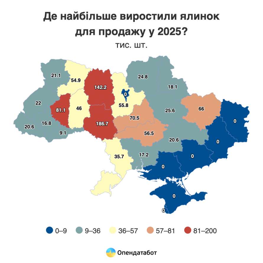 Найбільші обсяги святкових дерев для реалізації цього сезону зосереджені у двох регіонах: Вінниччина — 187 тисяч ялинок, або 19% від загальної кількості та Житомирщина — 142 тисячі, або 14%. Водночас саме Житомирська область залишається лідером за площею земель під вирощування хвойних — 640 гектарів. Це майже чверть від загальноукраїнської площі. За чотири роки вона скоротилася тут на 9%, але навіть на цій території росте близько 1,9 мільйона дерев.