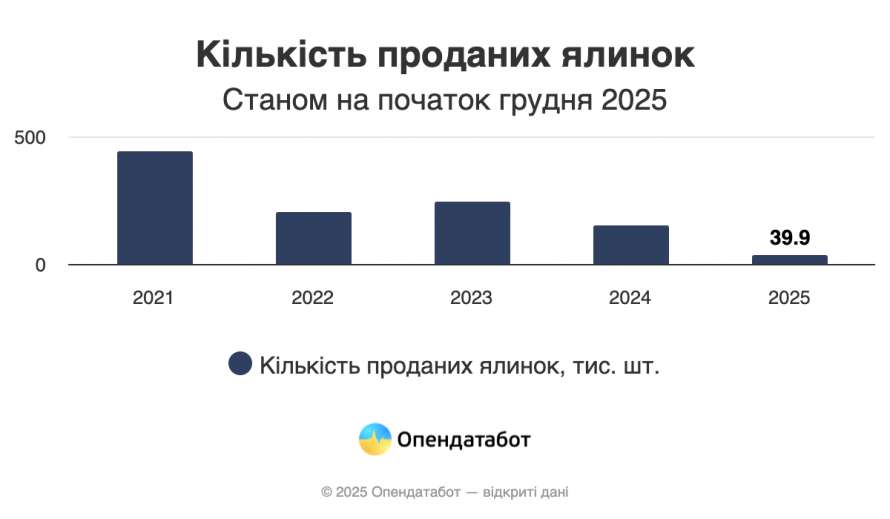 Втім попит на живі новорічні дерева падає ще швидше, аніж пропозиція. Так, лише 39,9 тисячі ялинок продали в Україні станом на середину грудня 2025 року. Це на 11% менше, ніж за аналогічний період минулого року. Для порівняння, за весь попередній сезон лісгоспи реалізували 153,7 тисячі дерев — це на 38% менше, ніж у сезоні 2023–2024, і майже на чверть менше, ніж у 2022–2023 роках.