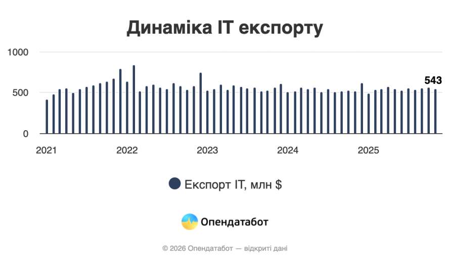 Варто зазначити, що щомісяця експорт ІТ-послуг приносить, в середньому, 543 млн доларів. Для порівняння, середній місячний показник становив 612 млн у 2022-му.