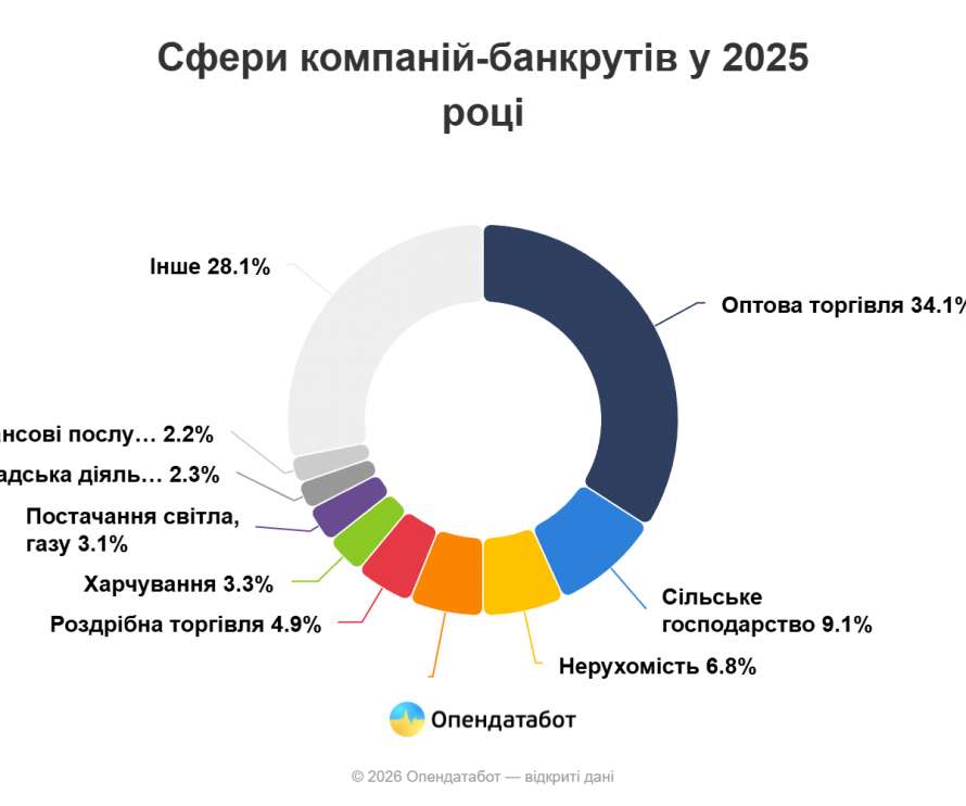 780 компаній розпочали процес судового банкрутства у 2025 році за даними Верховного суду України. Це близько 10% від загальної кількості припинень бізнесу. Обіги найбільших компаній-банкрутів коливаються від 3,4 до 7,7 млрд грн. Найчастіше банкрутами стають ТОВ. Неплатоспроможними торік ставали компанії, що займаються оптовою торгівлею та сільським господарством. За кількістю бізнесів-банкрутів лідирує Київ.