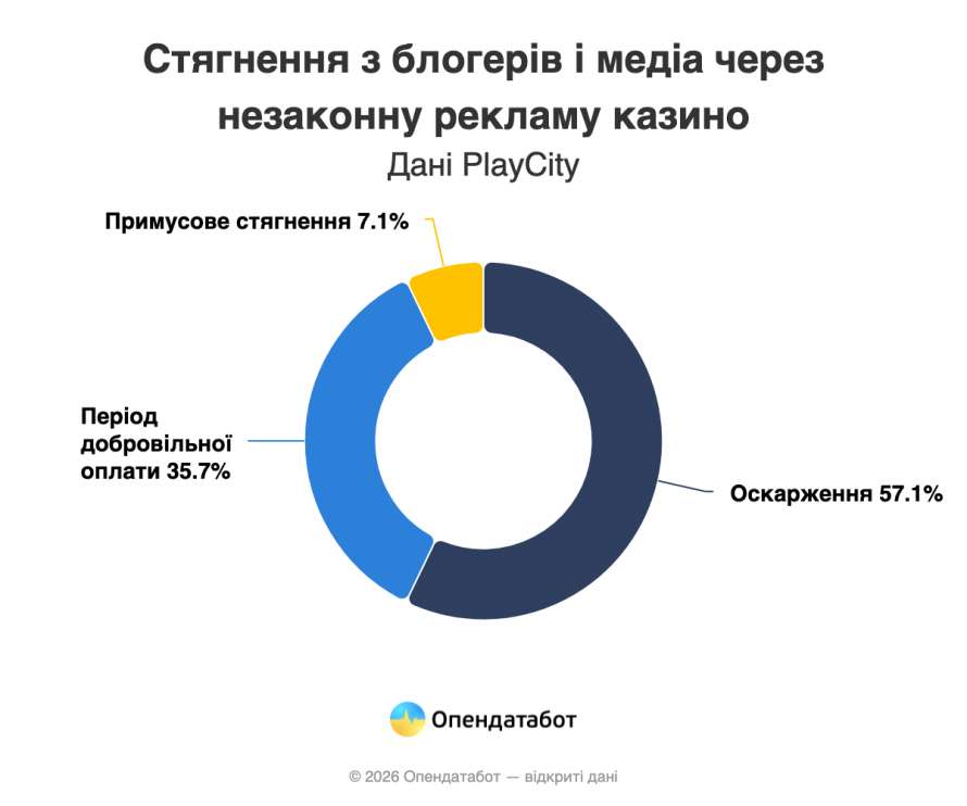 Перші багатомільйонні стягнення по штрафах за рекламу азартних ігор вже можна знайти у Єдиному реєстрі боржників. Загалом 13 блогерів та 1 Telegram-канал отримали штрафи від Державного агентства з контролю грального та лотерейного бізнесу в Україні PlayCity за рекламу онлайн-казино. Нині 8 штрафів порушники намагаються оскаржити. Наразі жоден штраф ще не був сплачений, проте частину вже передали на примусове виконання, а деякі оскаржують в суді.