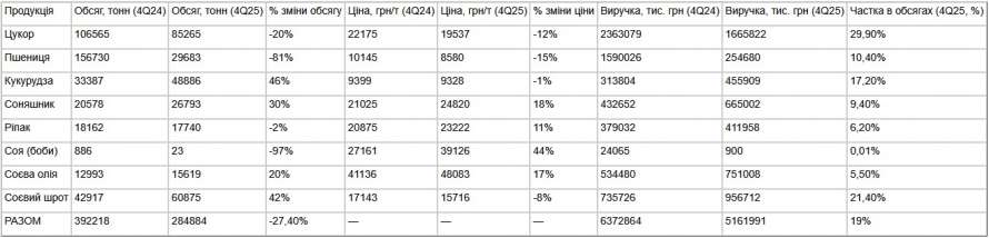 Реалізація сої у четвертому кварталі 2025 року скоротилася на 97% порівняно з аналогічним періодом 2024 року до 23 тонн, продукція подорожчала на 44%, до 39,126 тис. грн/тонна.