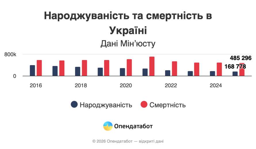 В Україні 2025 року зареєстровано 168,778 народження і 485,296 смертей, тож на одного новонародженого припадало близько трьох померлих, випливає з аналізу OpenDataBot на основі даних Мін'юсту.