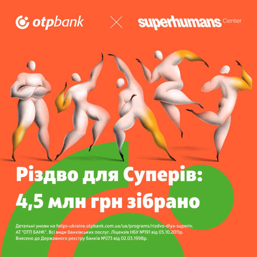 Як це було. У грудні Superhumans Center та ОТП БАНК провели аукціон-збір «Різдво для Суперів» у застосунку OTP Bank UA. Учасникам аукціону пропонувалися унікальні лоти. Їх підготували самі пацієнти Superhumans Center, які вже пройшли реабілітацію: ранкова пробіжка з марафонцем, який має протез, тренування з плавання із колишнім пацієнтом Superhumans Center, який переплив Босфор, квитки на виставу, екскурсія Superhumans Center тощо.