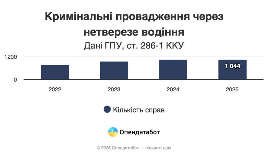 Водночас у 1 044 випадках за водіння у нетверезому відкрили кримінальні провадження за ст. 286-1 ККУ — такі дані наводить Генеральна прокуратура. Торік до суду дійшло 59% справ.