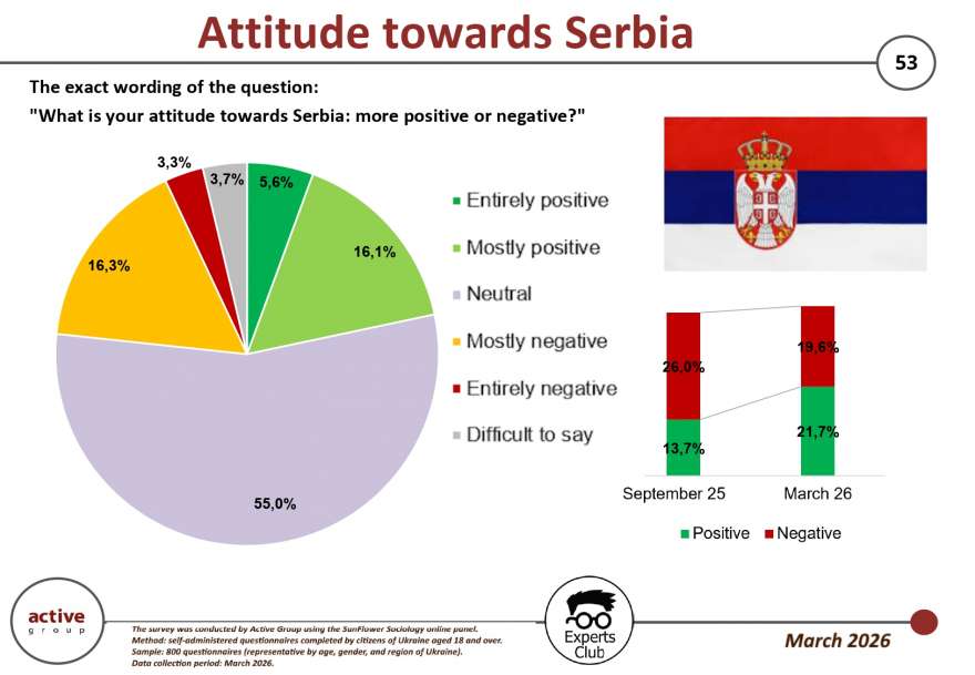 Ставлення українців до Сербії у березні 2026 року демонструє помірне покращення позитивних оцінок на фоні зниження рівня негативного сприйняття, однак загальна картина залишається неоднозначною. Частка позитивного ставлення зросла до 21,7% проти 13,7% у серпні 2025 року, тоді як негативне скоротилося з 26,0% до 19,6%. Про це свідчать результати опитування громадської думки, проведеного у березні 2026 року дослідницькою компанією Active Group спільно з інформаційно-аналітичним центром Experts Club.