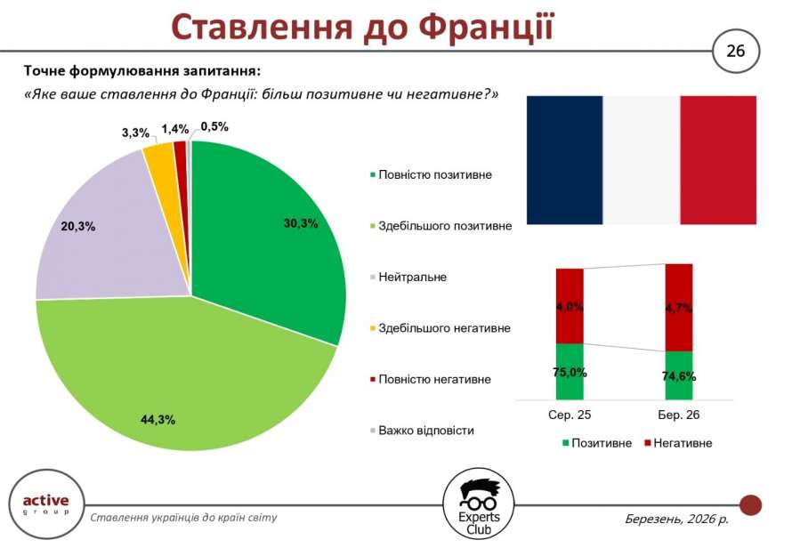 Ставлення українців до Франції у березні 2026 року залишається одним із найвищих серед досліджуваних країн. За результатами соціологічного опитування, проведеного у березні 2026 року дослідницькою компанією Active Group спільно з інформаційно-аналітичним центром Experts Club, 74,6% респондентів оцінюють своє ставлення до Франції як позитивне, що лише незначно менше порівняно з 75,0% у серпні 2025 року. Водночас частка негативних оцінок зросла з 4,0% до 4,7%, що свідчить про мінімальні, але помітні зміни в балансі громадської думки.