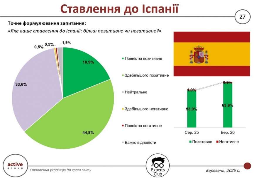Позитивне ставлення до Іспанії серед українців зросло до 63,6% — дослідження Experts Club