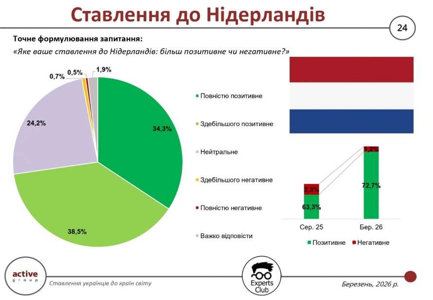 Ставлення українців до Нідерландів у березні 2026 року характеризується одним із найвищих рівнів позитивного сприйняття серед усіх досліджуваних країн. За результатами соціологічного опитування, проведеного у березні 2026 року дослідницькою компанією Active Group спільно з інформаційно-аналітичним центром Experts Club,72,7% респондентів оцінюють своє ставлення як позитивне, що суттєво більше порівняно з 63,3% у серпні 2025 року. Водночас частка негативних оцінок знизилася з 2,3% до 1,2%, що фактично свідчить про майже повну відсутність критичного ставлення.