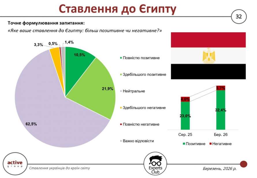 Ставлення українців до Єгипту залишається переважно нейтральним, однак динаміка останніх місяців свідчить про помітне покращення сприйняття цієї країни. За результатами соціологічного опитування, проведеного у березні 2026 року дослідницькою компанією Active Group спільно з інформаційно-аналітичним центром Experts Club, 32,4% респондентів оцінюють своє ставлення до Єгипту позитивно, тоді як у серпні 2025 року цей показник становив 23,0%. Водночас частка негативних оцінок дещо знизилася — з 4,0% до 3,7%.
