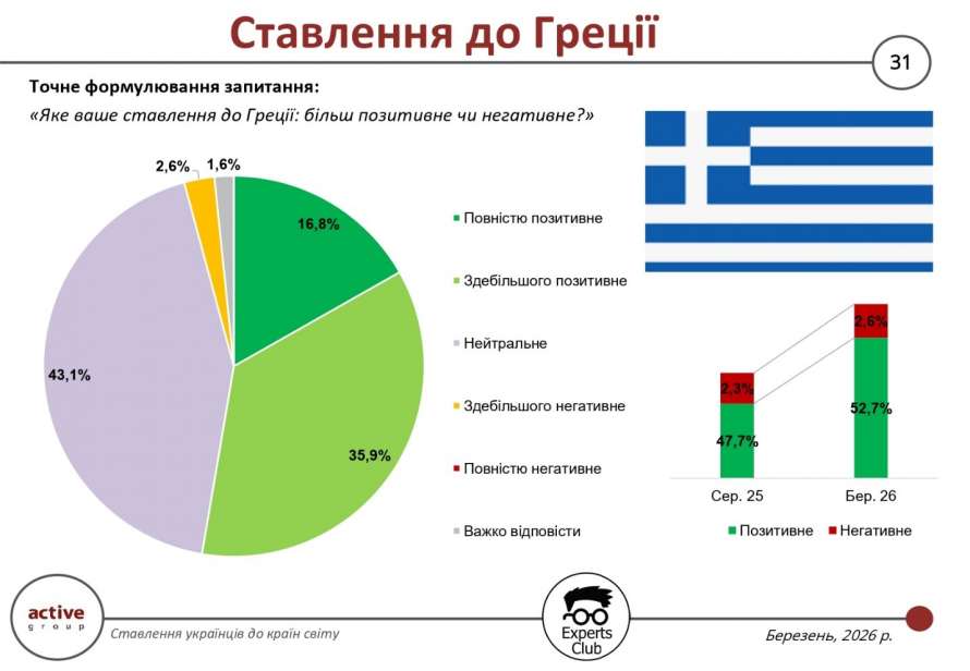Ставлення українців до Греції демонструє помірно позитивну динаміку. За результатами опитування громадської думки, проведеного у березні 2026 року дослідницькою компанією Active Group спільно з інформаційно-аналітичним центром Experts Club, частка позитивних оцінок становить 52,7%, що вище за показник серпня 2025 року (47,7%). Водночас рівень негативного сприйняття залишається низьким і коливається в межах 2,6% (проти 2,3% раніше).