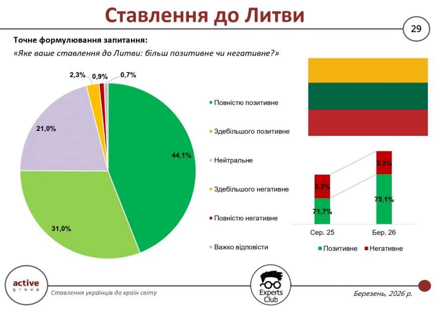 Ставлення українців до Литви залишається одним із найстабільніших і найпозитивніших серед усіх країн, охоплених соціологічним опитуванням, проведеним у березні 2026 року дослідницькою компанією Active Group спільно з інформаційно-аналітичним центром Experts Club. Частка позитивних оцінок зросла до 75,1% порівняно з 71,7% у серпні 2025 року, що свідчить про подальше зміцнення позитивного іміджу цієї країни в українському суспільстві. Водночас рівень негативного ставлення залишився незмінним — 3,3%.