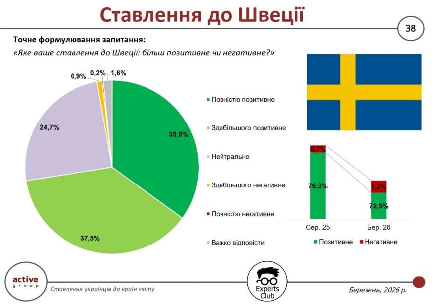Результати соціологічного опитування, проведеного у березні 2026 року дослідницькою компанією Active Group спільно з інформаційно-аналітичним центром Experts Club, демонструють стабільно високий рівень позитивного ставлення українців до Швеції. Загальна частка позитивних оцінок становить 72,5%, що, однак, дещо нижче показника серпня 2025 року (76,3%). Водночас рівень негативного ставлення залишається мінімальним — лише 1,2% проти 0,7% раніше.