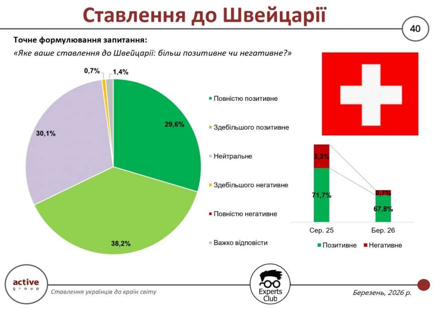 Результати опитування, проведеного у березні 2026 року дослідницькою компанією Active Group спільно з інформаційно-аналітичним центром Experts Club, свідчать про збереження високого рівня позитивного ставлення українців до Швейцарії, хоча загальна частка позитивних оцінок дещо знизилася порівняно з серпнем 2025 року — з 71,7% до 67,8%. Водночас негативне ставлення скоротилося з 3,3% до 0,7%, що підтверджує стабільно низький рівень критичного сприйняття цієї країни.