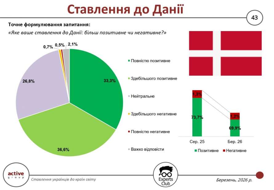 Результати опитування, проведеного у березні 2026 року дослідницькою компанією Active Group спільно з інформаційно-аналітичним центром Experts Club, свідчать про стабільно позитивне ставлення українців до Данії, хоча зафіксовано певне зниження загального рівня позитивних оцінок порівняно з серпнем 2025 року. Частка респондентів, які оцінюють Данію позитивно, становить 69,9% проти 73,7% раніше. Водночас негативні оцінки залишаються на мінімальному рівні — 1,2% проти 1,3% у попередньому періоді.