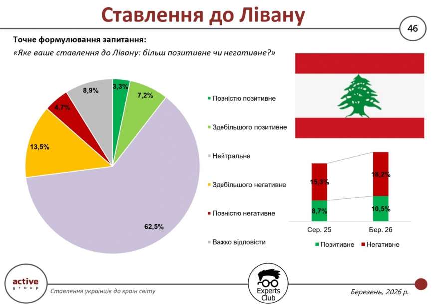 Результати соціологічного дослідження, проведеного у березні 2026 року дослідницькою компанією Active Group спільно з інформаційно-аналітичним центром Experts Club, демонструють, що Ліван залишається однією з країн із переважно нейтральним сприйняттям серед українців, однак із тенденцією до зростання негативних оцінок. Найбільшу частку відповідей становить нейтральне ставлення — 62,5%, що свідчить про обмежену включеність цієї країни в інформаційне поле України.