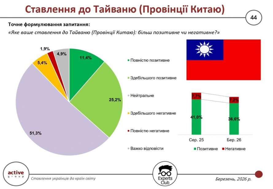 Результати опитування, проведеного у березні 2026 року дослідницькою компанією Active Group спільно з інформаційно-аналітичним центром Experts Club, свідчать, що ставлення українців до Тайваню (у формулюванні — «Провінції Китаю») залишається переважно нейтральним, попри наявність помірного позитивного сегмента. Частка респондентів, які оцінюють Тайвань позитивно, становить 36,6%, що нижче показника серпня 2025 року (41,0%). Водночас негативні оцінки дещо скоротилися — до 7,2% проти 7,7%.