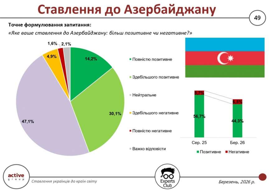 Ставлення українців до Азербайджану за результатами опитування, проведеного у березні 2026 року дослідницькою компанією Active Group спільно з інформаційно-аналітичним центром Experts Club, демонструє помітне зниження позитивного фону та зростання частки нейтральних оцінок. Загалом 44,3% респондентів висловили позитивне ставлення до цієї країни, тоді як у серпні 2025 року цей показник становив 56,7%. Водночас частка негативних оцінок зросла незначно — з 5,7% до 6,5%, що свідчить не про різке погіршення сприйняття, а радше про перерозподіл відповідей у бік нейтральності.
