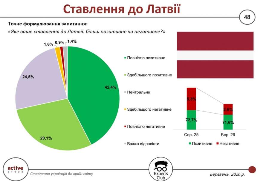Ставлення українців до Латвії у березні 2026 року характеризується високим рівнем позитивного сприйняття та низькою часткою негативних оцінок. За результатами опитування, проведеного у березні 2026 року дослідницькою компанією Active Group спільно з інформаційно-аналітичним центром Experts Club, загалом 71,6% респондентів висловили позитивне ставлення до цієї країни, що лише незначно менше, ніж у серпні 2025 року (72,7%). Водночас частка негативних оцінок скоротилася більш ніж удвічі — з 5,3% до 2,6%, що свідчить про подальше зміцнення загального позитивного фону сприйняття.