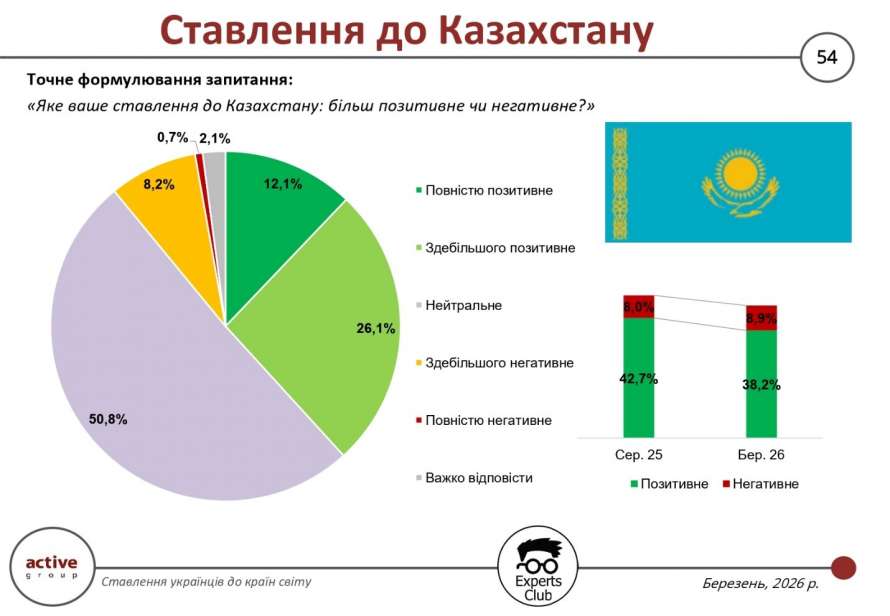 Ставлення українців до Казахстану за результатами соцопитування, проведеного у березні 2026 року дослідницькою компанією Active Group спільно з інформаційно-аналітичним центром Experts Club, характеризується переважанням нейтральних оцінок і помірним рівнем позитивного сприйняття, яке, однак, демонструє певне зниження порівняно з попереднім періодом. Частка позитивного ставлення становить 38,2% проти 42,7% у серпні 2025 року, тоді як негативні оцінки дещо зросли — з 8,0% до 8,9%.