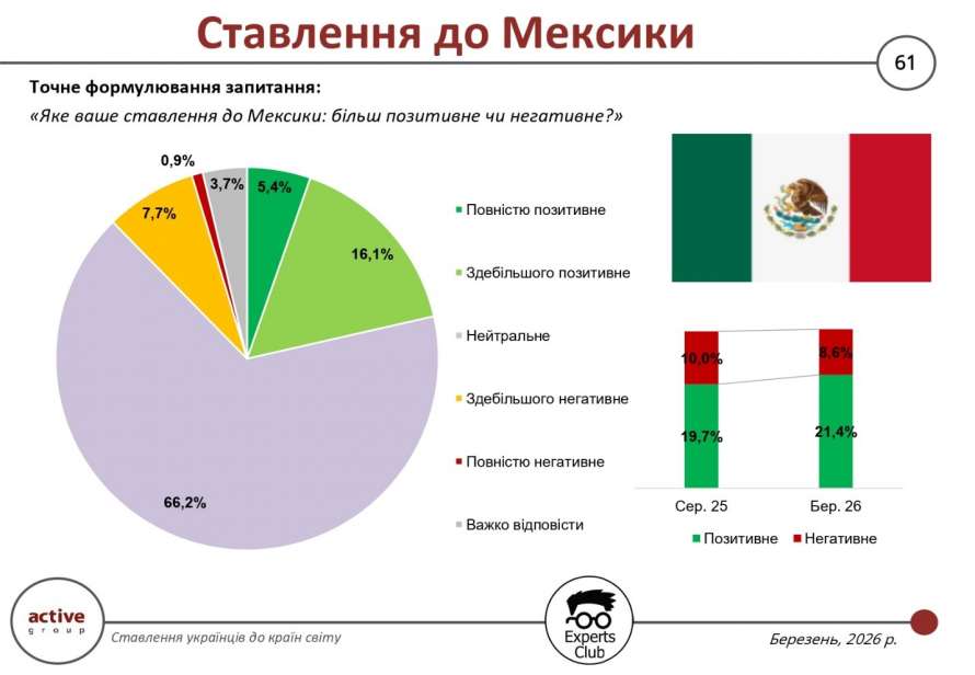 Сумарна частка позитивного ставлення до Мексики становить 21,5%, з яких 5,4% респондентів обрали варіант «повністю позитивне», а ще 16,1% — «здебільшого позитивне». Порівняно з серпнем 2025 року цей показник зріс (з 19,7% до 21,4%), що свідчить про поступове зміцнення позитивного сприйняття, хоча воно все ще залишається відносно обмеженим.