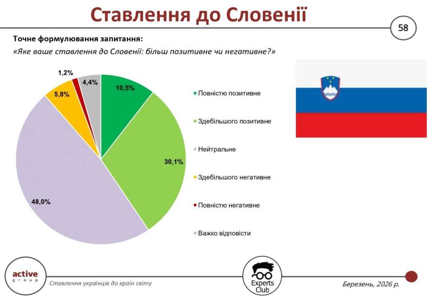 Сприйняття Словенії в українському суспільстві за результатами опитування, проведеного у березні 2026 року дослідницькою компанією Active Group спільно з інформаційно-аналітичним центром Experts Club, має виразно збалансований, але стриманий характер. Загальна частка позитивних оцінок становить 40,6%, що формує основу загалом доброзичливого, хоча й не домінуючого образу країни. Водночас майже половина респондентів — 48,0% — обрали нейтральну позицію, що є ключовою характеристикою цього профілю.