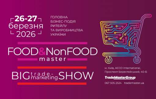 26-27 березня 2026 року у ВЦ «АККО Інтернешнл» (м. Київ,пр. Берестейський, 40-Б) відбудеться ХVІІ щорічна виставка і конференція Food&NonFood Master & Big Trade-Marketing Show-2026. Це ключова подія для представників рітейлу та FMCG-ринку України, яка об'єднає понад 2000 учасників, серед яких власники, генеральні директори, керівники закупівель, маркетингу та продажів провідних компаній